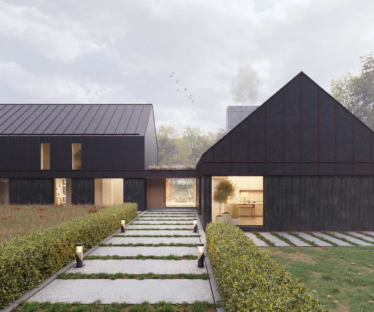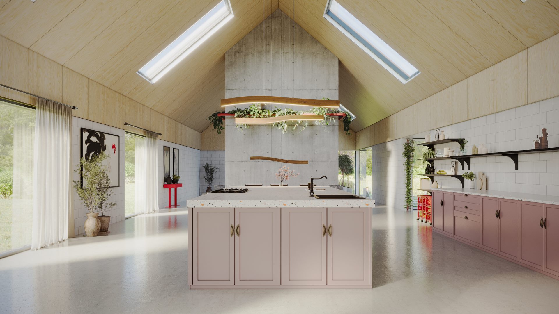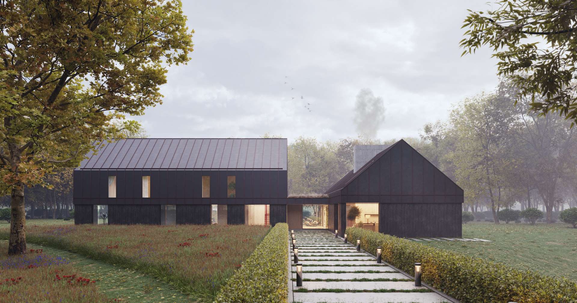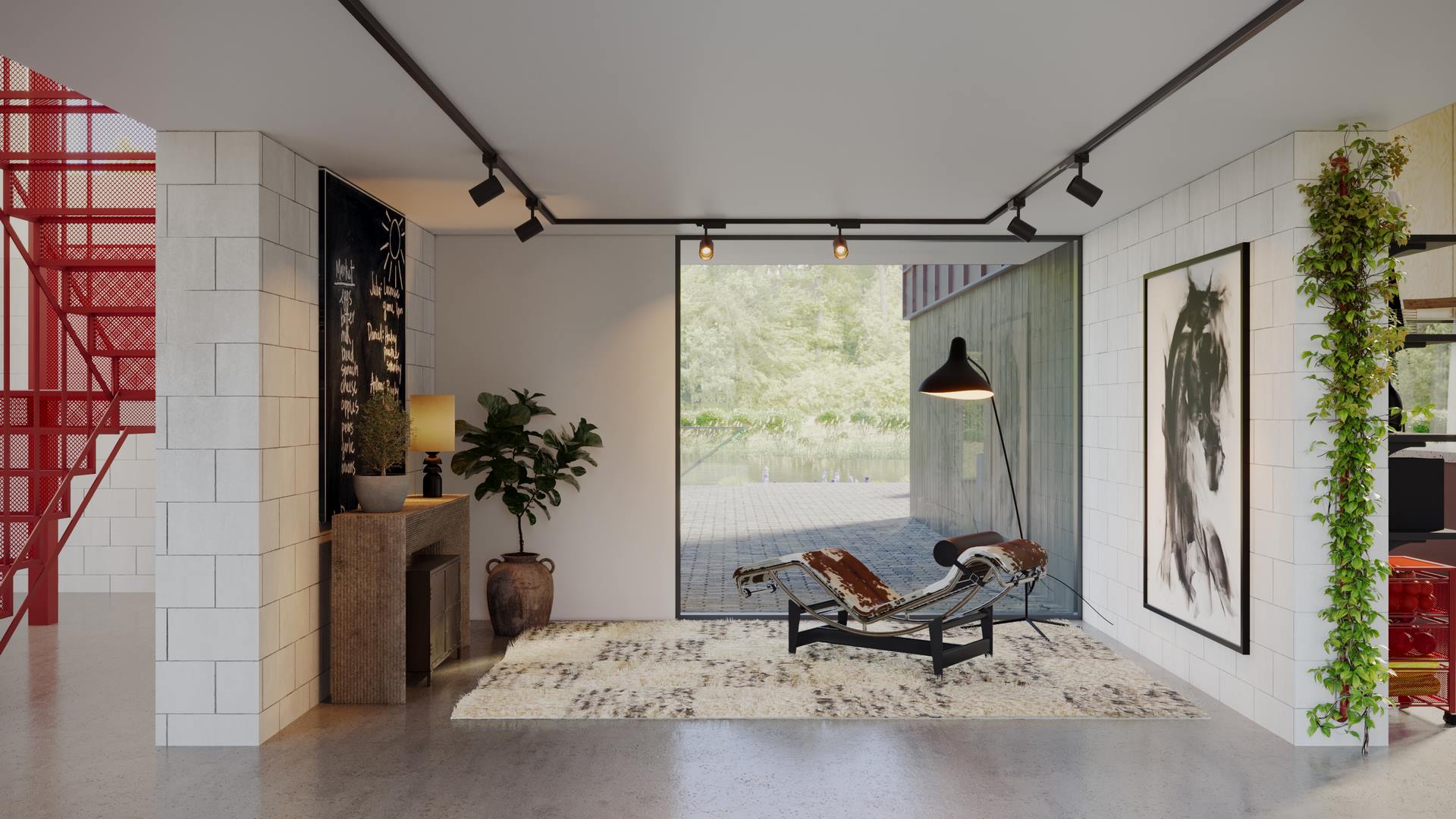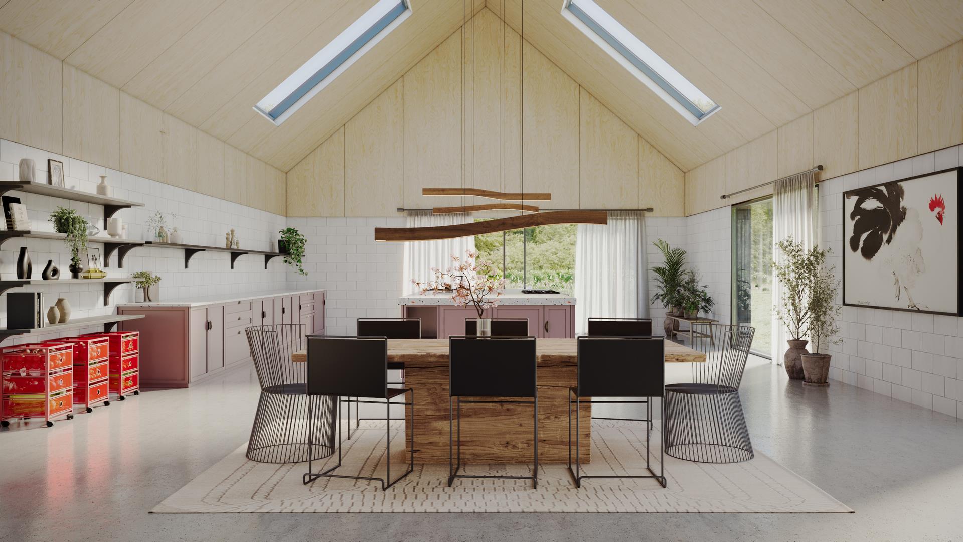 “A tactile twist on the barn house. This space is filled with flashes of the unexpected with a heart of red steel.”